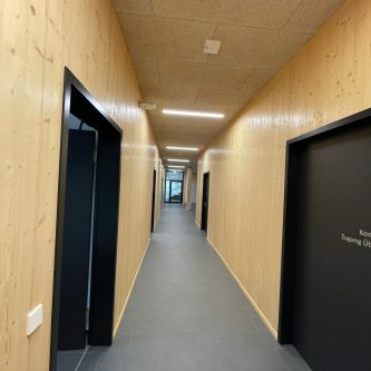Meisterbüro und Sozialräume mit Brettschichtholzdecke und Wandverkleidung in kuststoffbeschichteten Platten. -