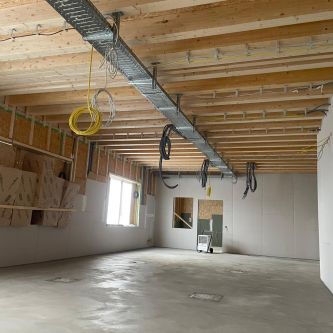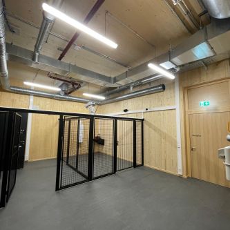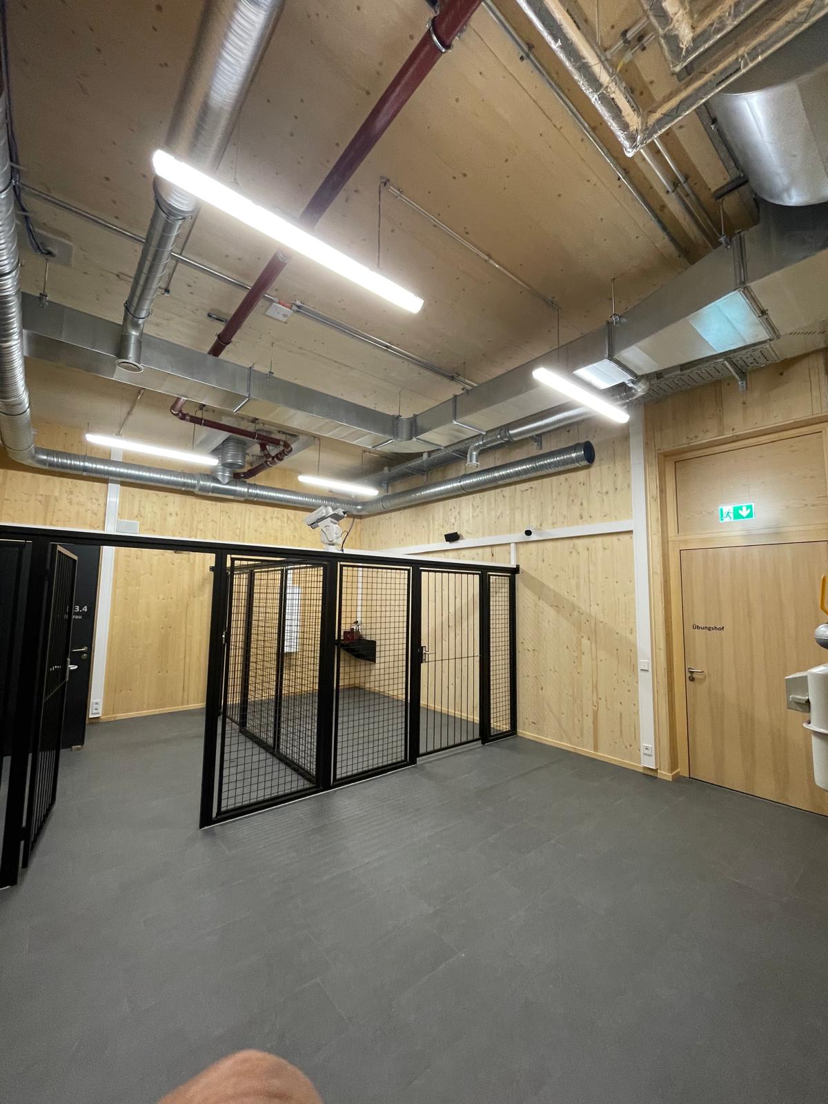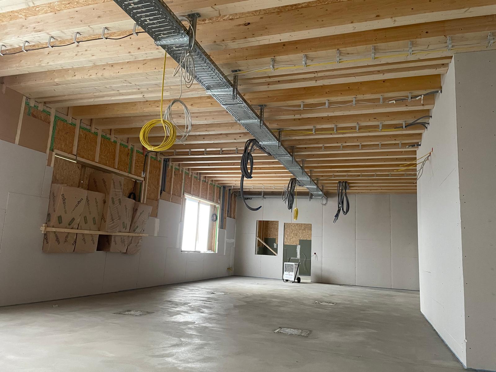 Meisterbüro und Sozialräume mit Brettschichtholzdecke und Wandverkleidung in kuststoffbeschichteten Platten. -