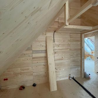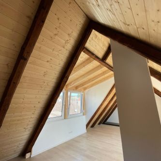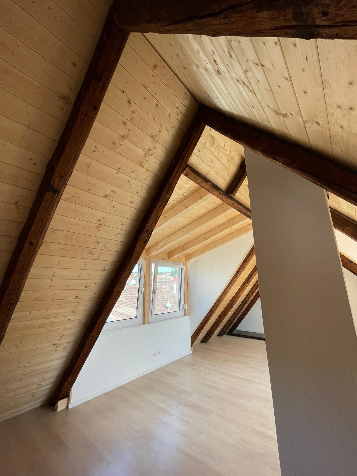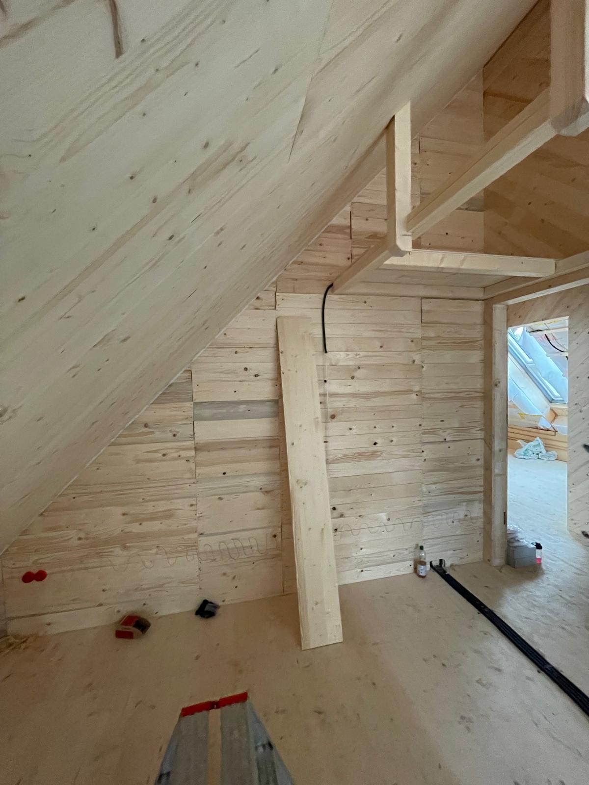 Kompletter Innenausbau mit Fußboden, Paneeldecke und Einbauschrank in Trempel eines Dachspitzes -